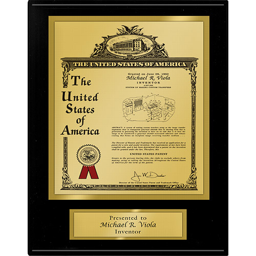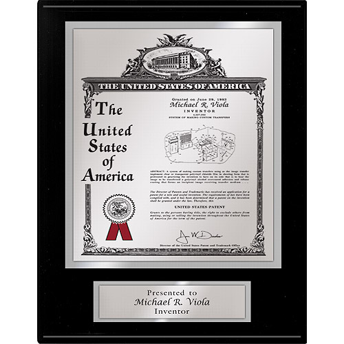 This Traditional Patent Plaque has satin front plates, and bright aluminum back plates, mounted to a 12″ x 15″, shiny black piano board. The presentation plate at the bottom allows you to proudly display your name as the inventor.